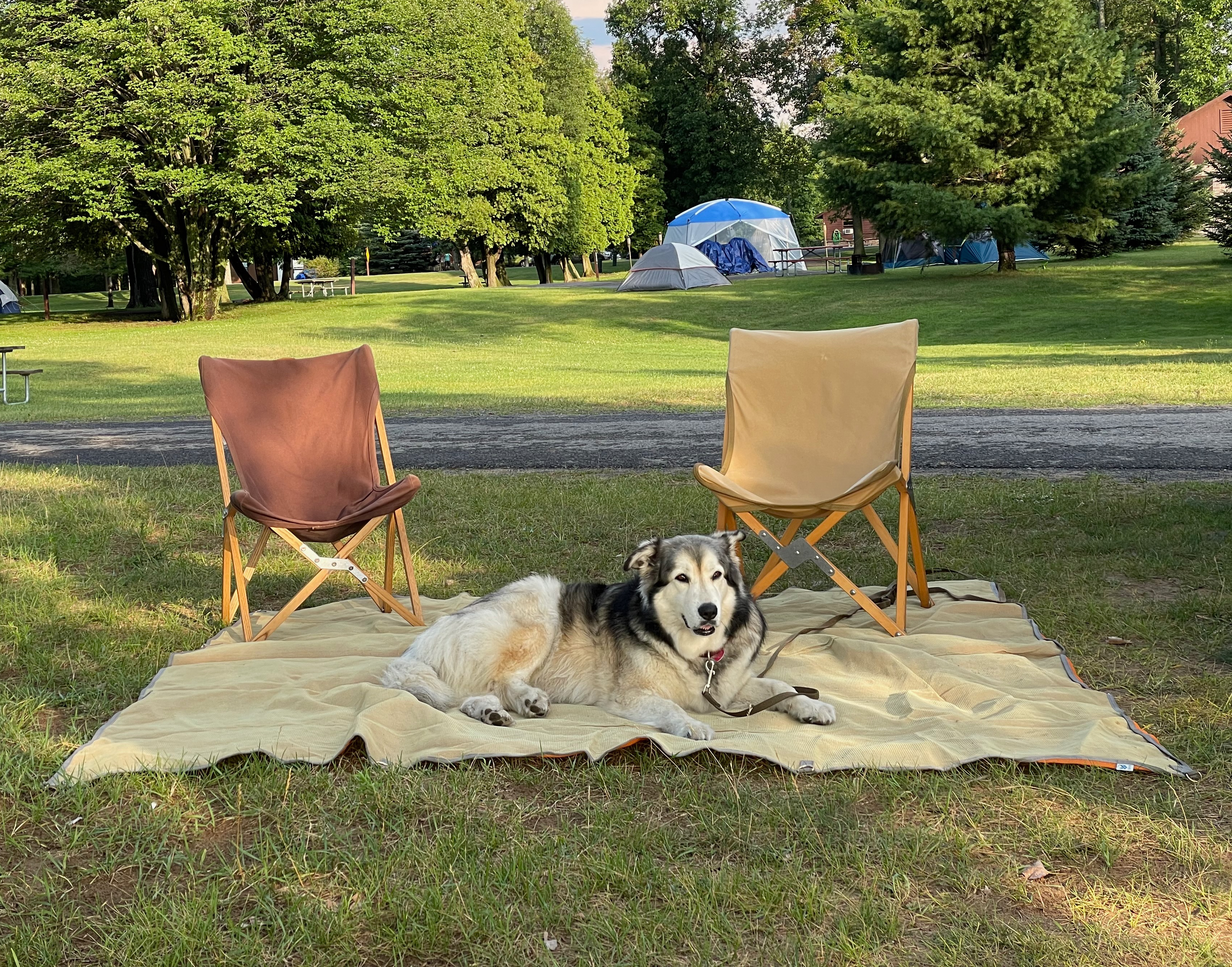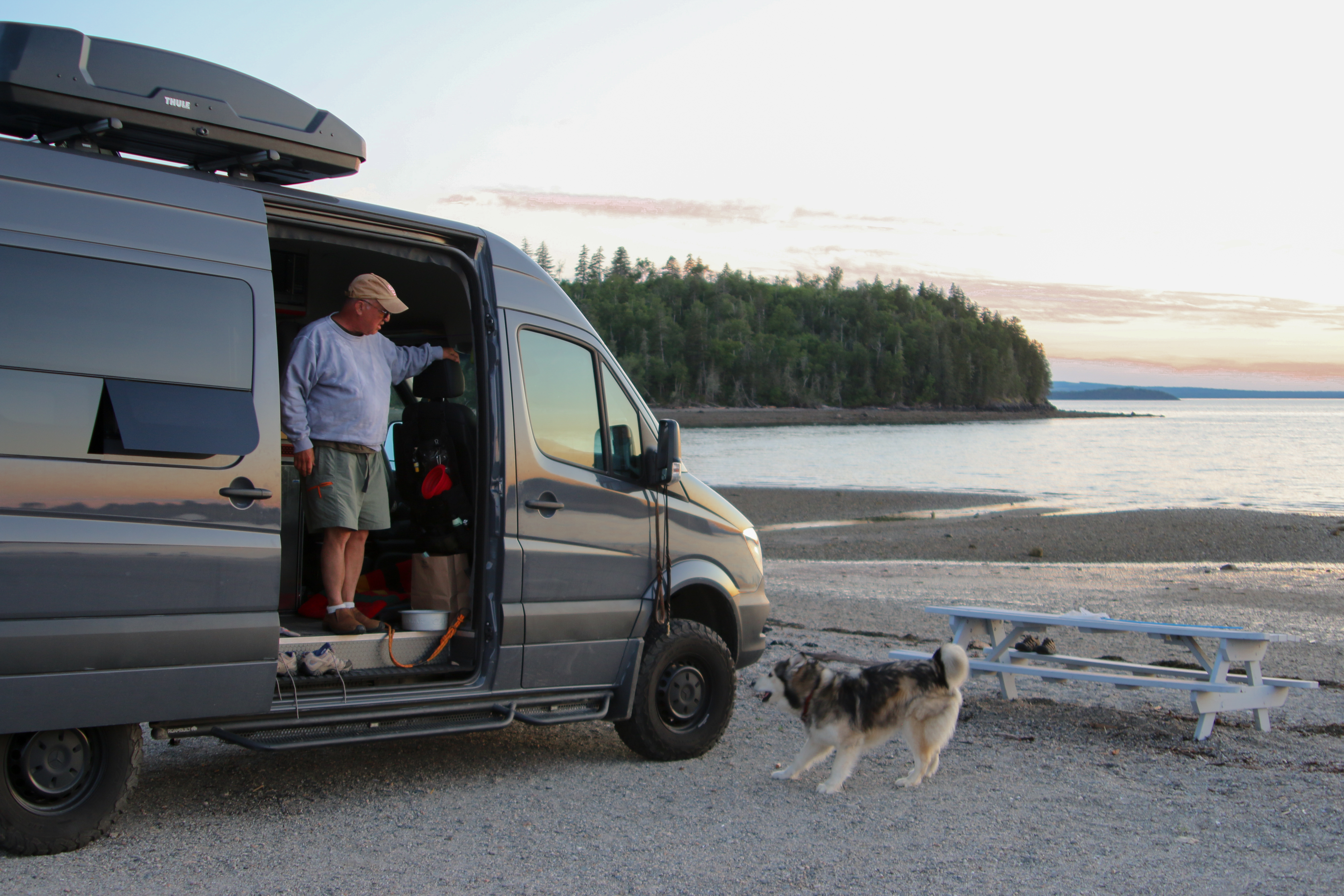 An early inspiration for our van travels was Steinbeck’s Travels with Charley. We were fortunate to adopt Nicky who turned out to be a great traveler: intrepid, incredibly well-behaved, and a magnet for people of all ages to talk with us. The typical opening question is “What breed is she?” (Answer: half Husky, quarter Chesapeake Bay Retriever, quarter Mastiff.) She is such a draw that sometimes in a parking lot we collect a crowd of kids wanting to pet her. (One kid scratched her under the collar and announced proudly he knew the “special spot” for huskies.) We also get to hear many funny stories about husky adventures and behavior. In Jamestown, NY, we happened upon a public market in a section of the city with a large numbers of older people and people with disabilities out on the sidewalks. Many were thrilled to spend time with her (and talk with us). Like Charley, Nicky has been our opening to talk with many people we otherwise would not meet.